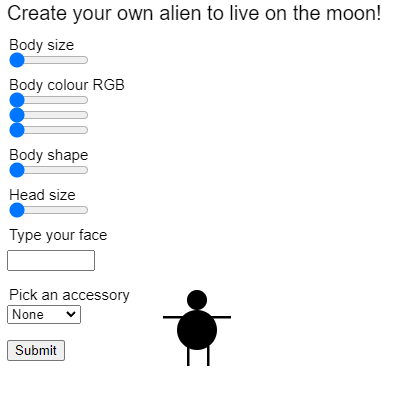 Alien Invasion is an interactive simulation where you can make a customisable alien to populate the moon. You can modify the alien’s body shape, size, and colour by using sliders. You can even add accessories and create your own typable face using a dropdown and textbox. Make as many aliens as you want to increase the moon’s population and watch them run around. You can even interact with the moon and space around it. Try moving and clicking your mouse to find out what happens.